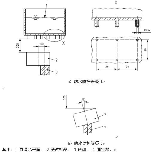 防水試驗包括第二伴特征數(shù)字為1至8,即防護等級代碼為IPX1至IPX8