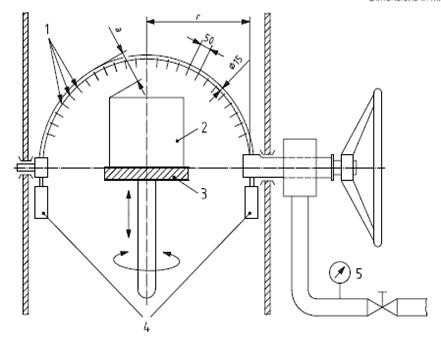 1 直徑D的孔;2 受試樣品;3 轉盤;4平衡量; 5流量指示器和壓力計;r200,400,600或800;按受試樣品尺寸選擇最小的半徑; D = 0.4防水防護等級3和4;D = 0.8防水防護等級4K; 受試樣品的速度(1~3)min-1。