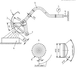 1 可移動置;2 噴淋管;3 軟管;4 流量指示器和壓力計;5 旋塞閥;6 受試樣品;7 平衡量;8 裝置的孔徑;
