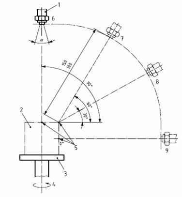 1 鼓風噴射噴嘴;2 受試樣品;3 轉臺;4 轉軸; 5 參考點(0°,30°,60°,90°)對受試樣品柱面分面;6 位置1;7 位置2;8 位置3;9 位置4;