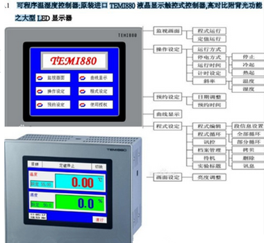 可編程TEMI880控制器:智能型溫濕度可程式控制器以液晶屏方式顯示溫濕度值,有加熱器、傳感器故障指示、變送功能、帶有RS/232或RS/485通訊接口可供遠程監(jiān)控,用戶可通過觸屏編程自行設(shè)定系統(tǒng)參數(shù)。采用高精度的濕敏電阻為傳感器,對設(shè)備的溫度和濕度進行實時監(jiān)控并通過負載進行有效的控制。該儀表集測量、顯示、控制及通訊于一體,精度高、測量范圍寬。5.7寸彩色液晶顯示屏,中英文畫面選擇觸控式屏幕面板,操作簡單,程序編輯容易。120組程序最大容量,每組可記憶100段溫濕度??娠@示完整的系統(tǒng)操作狀況、實時顯示執(zhí)行及設(shè)定程序曲線。具有多項擴充功能,控制器可經(jīng)由RS/232或RS/485接口與計算機聯(lián)機,可連接打印機打印溫濕度曲線監(jiān)控數(shù)據(jù)。故障報警,并顯示排除故障的方法。采用先進的專用微處理器芯片,可靠性高,抗干擾能力強。