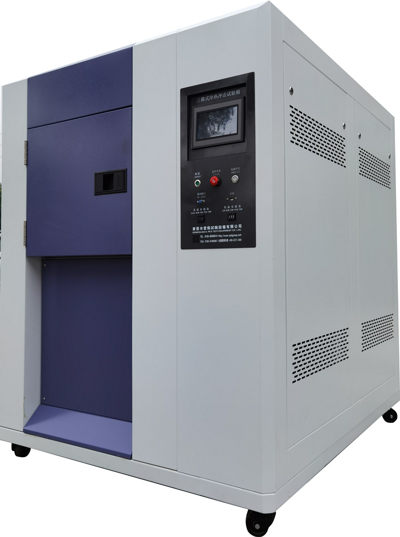 1、三箱設(shè)備區(qū)分為高溫區(qū)、低溫區(qū)、測(cè)試區(qū)三部分,測(cè)試樣品完全靜止于測(cè)試區(qū)。采用獨(dú)特之蓄熱、蓄冷結(jié)構(gòu),強(qiáng)制冷熱風(fēng)路切換方式導(dǎo)入測(cè)試區(qū),沖擊時(shí)高溫區(qū)或低溫區(qū)的溫度沖入測(cè)試區(qū)進(jìn)行沖擊,完成冷熱溫度沖擊測(cè)試。