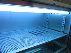 1.試驗(yàn)箱的結(jié)構(gòu)由耐腐蝕金屬材料制成,包含8只熒光紫外燈,試驗(yàn)樣品架和溫度、時(shí)間控制系統(tǒng)及指示器。